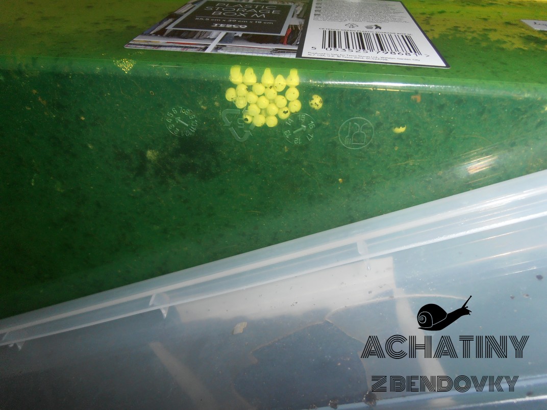 poznámky: 10. 6. vybráni 3 šnečci, zbytek dán na zkrm; 28. 6. zbyl jen 1 - 12. 7. nalezen mrtvý